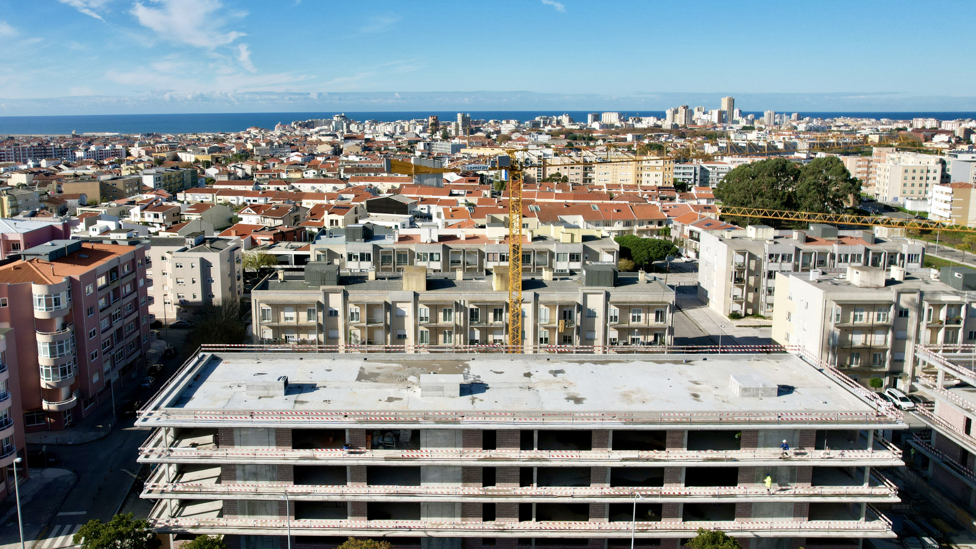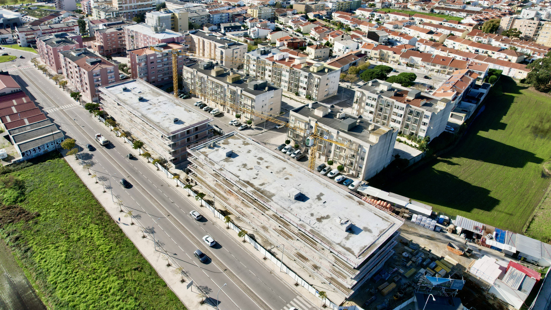 Na Fase 2, a conclusão da estrutura de betão armado permitiu o arranque das alvenarias, atualmente em execução no piso 4, com os pisos inferiores já concluídos. Simultaneamente, na cobertura prosseguem os trabalhos de preparação dos enchimentos com betão leve e betonilhas, etapa que antecede a impermeabilização.