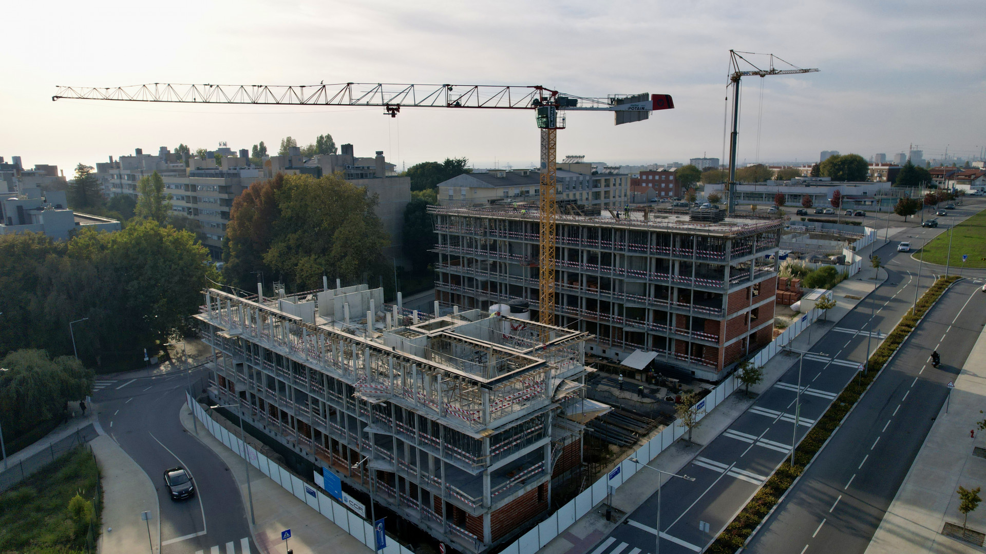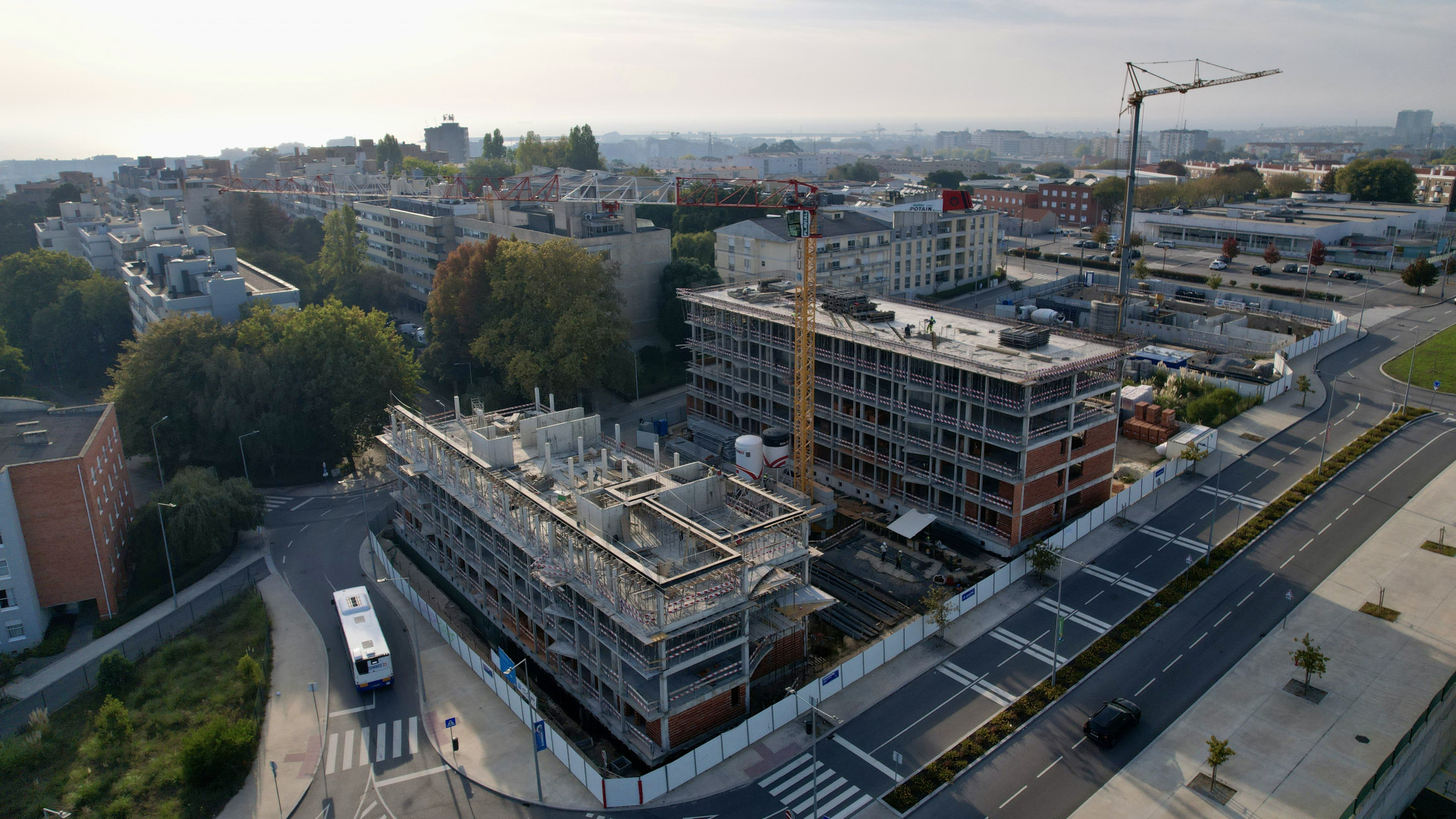 A empreitada do Conjunto Habitacional Estádio do Mar, em Matosinhos, prossegue a bom ritmo, com várias frentes de trabalho em curso e os pavimentos térreos dos três edifícios já concluídos.