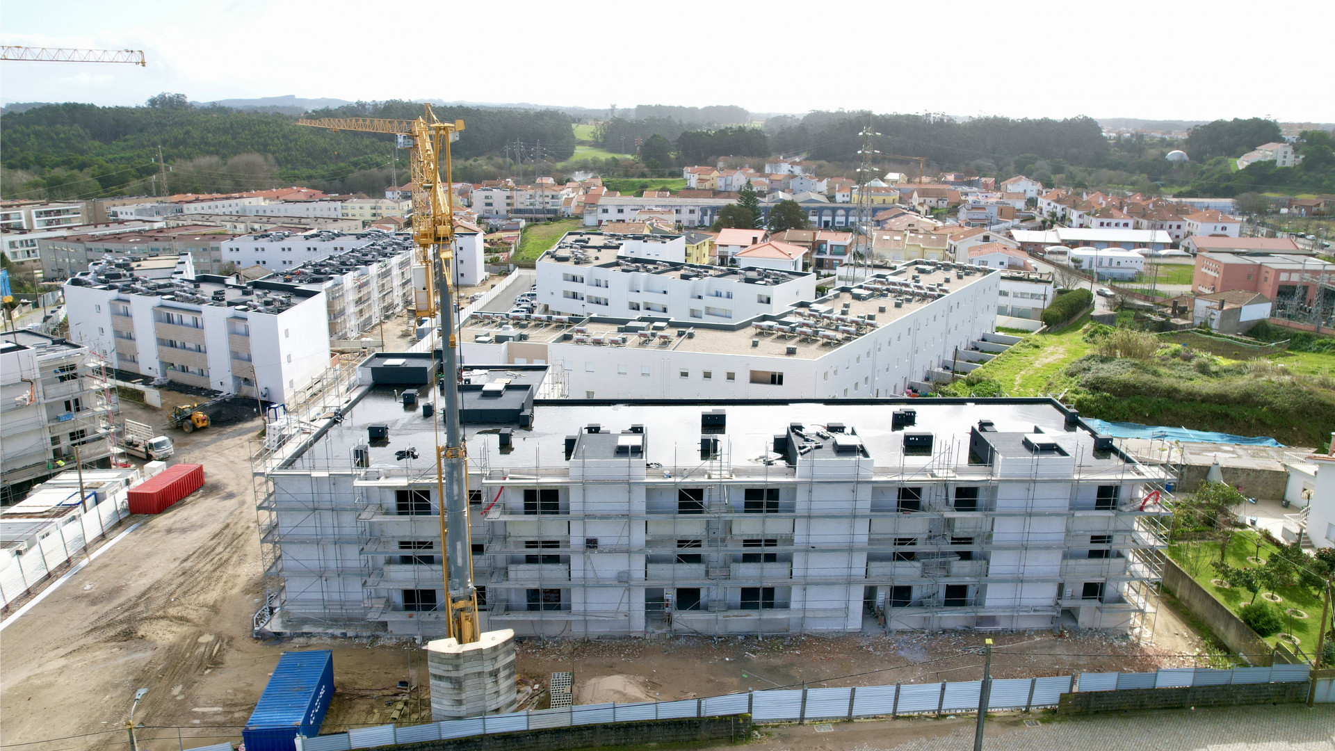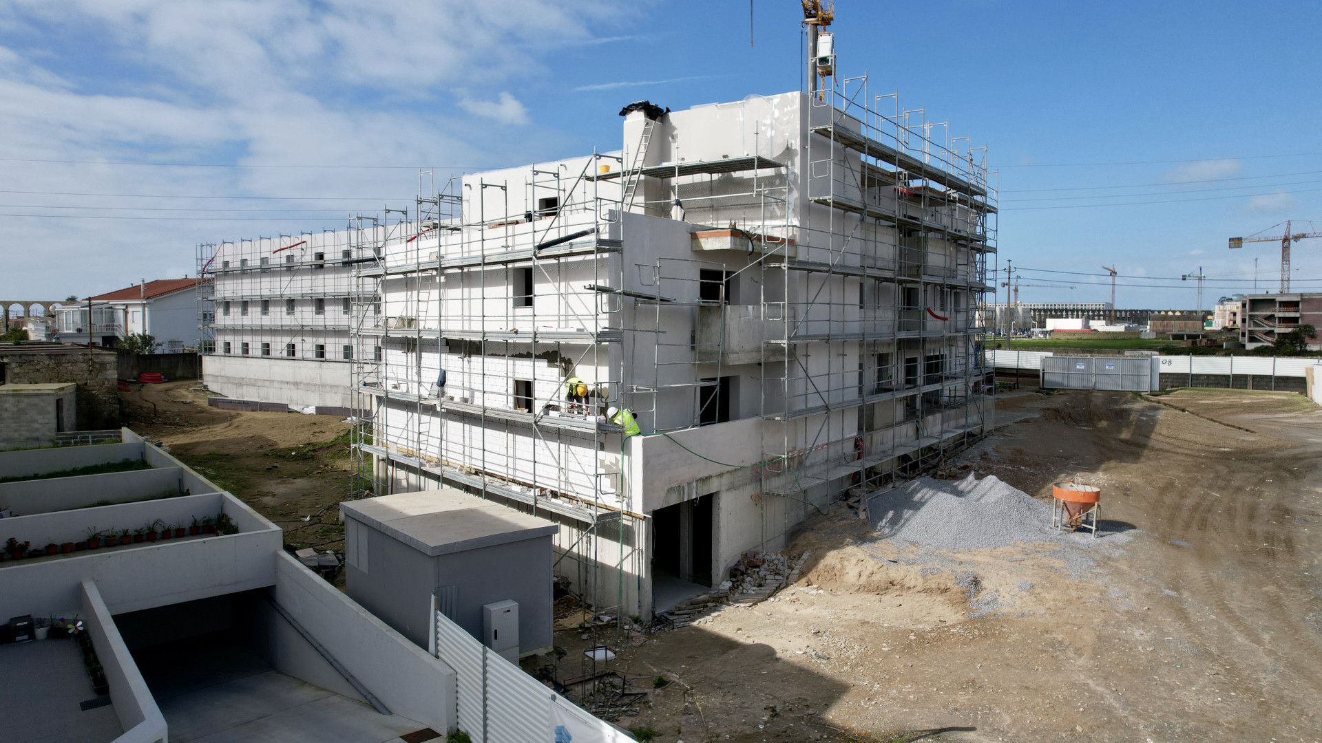 Atualmente, está em curso a aplicação do sistema ETIC’s, o assentamento de revestimentos cerâmicos em instalações sanitárias, zonas comuns e fachadas, a execução de gesso projetado e rebocos, a montagem de gesso cartonado, bem como a instalação de aparelhagem elétrica em ambos os blocos.