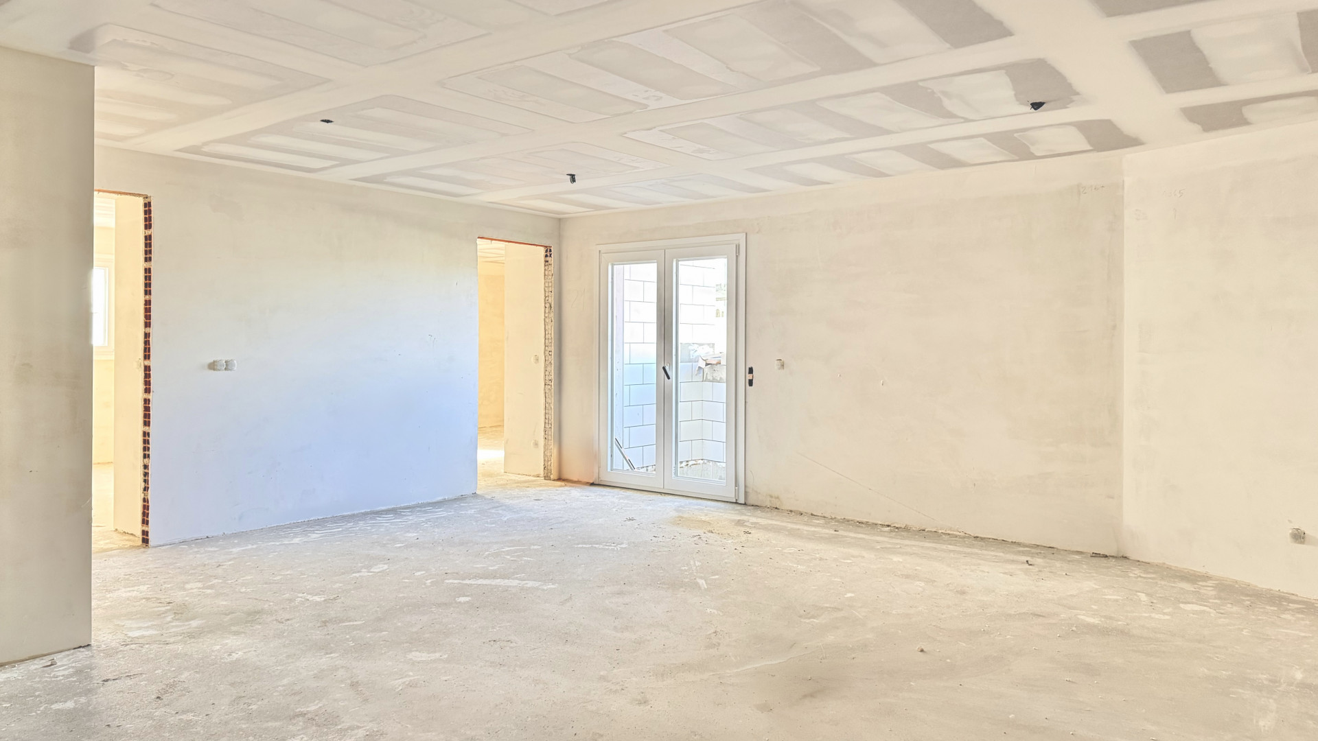 Em ambos os edifícios, encontram-se concluídas as infraestruturas das especialidades, incluindo a passagem de tubagens e cabos, bem como os enchimentos e regularização de pavimentos, permitindo a transição estruturada para a fase de acabamentos.