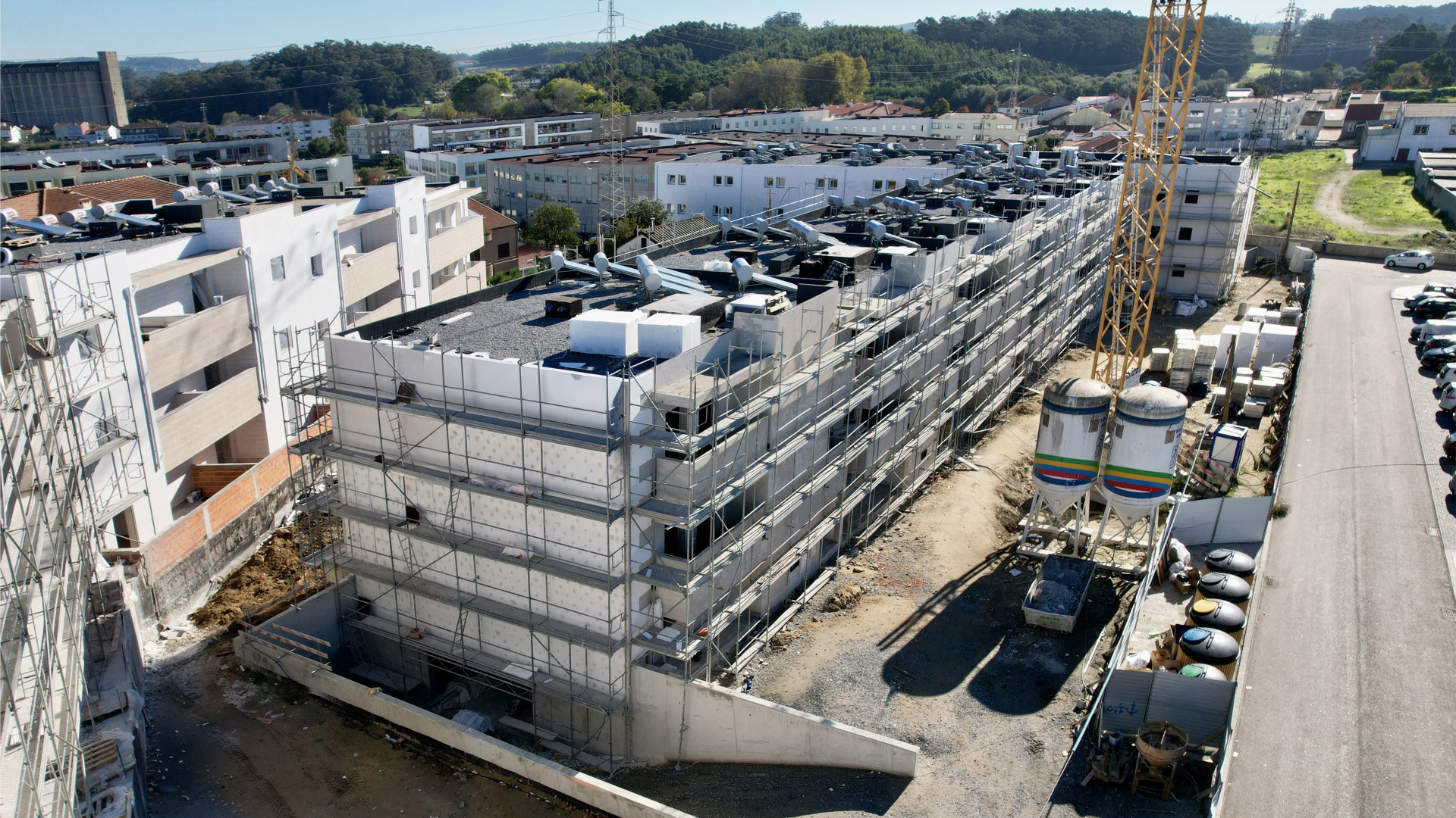 No Edifício 1, prosseguem a execução do sistema ETICS e a aplicação do revestimento cerâmico de fachada, a par dos revestimentos interiores de paredes.