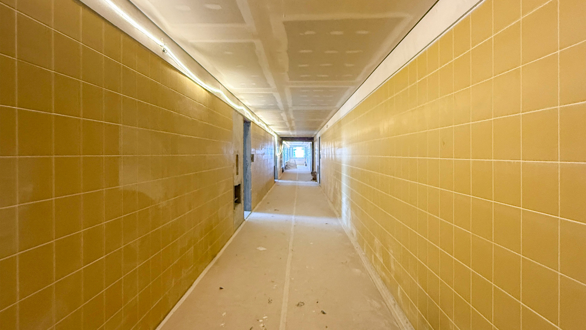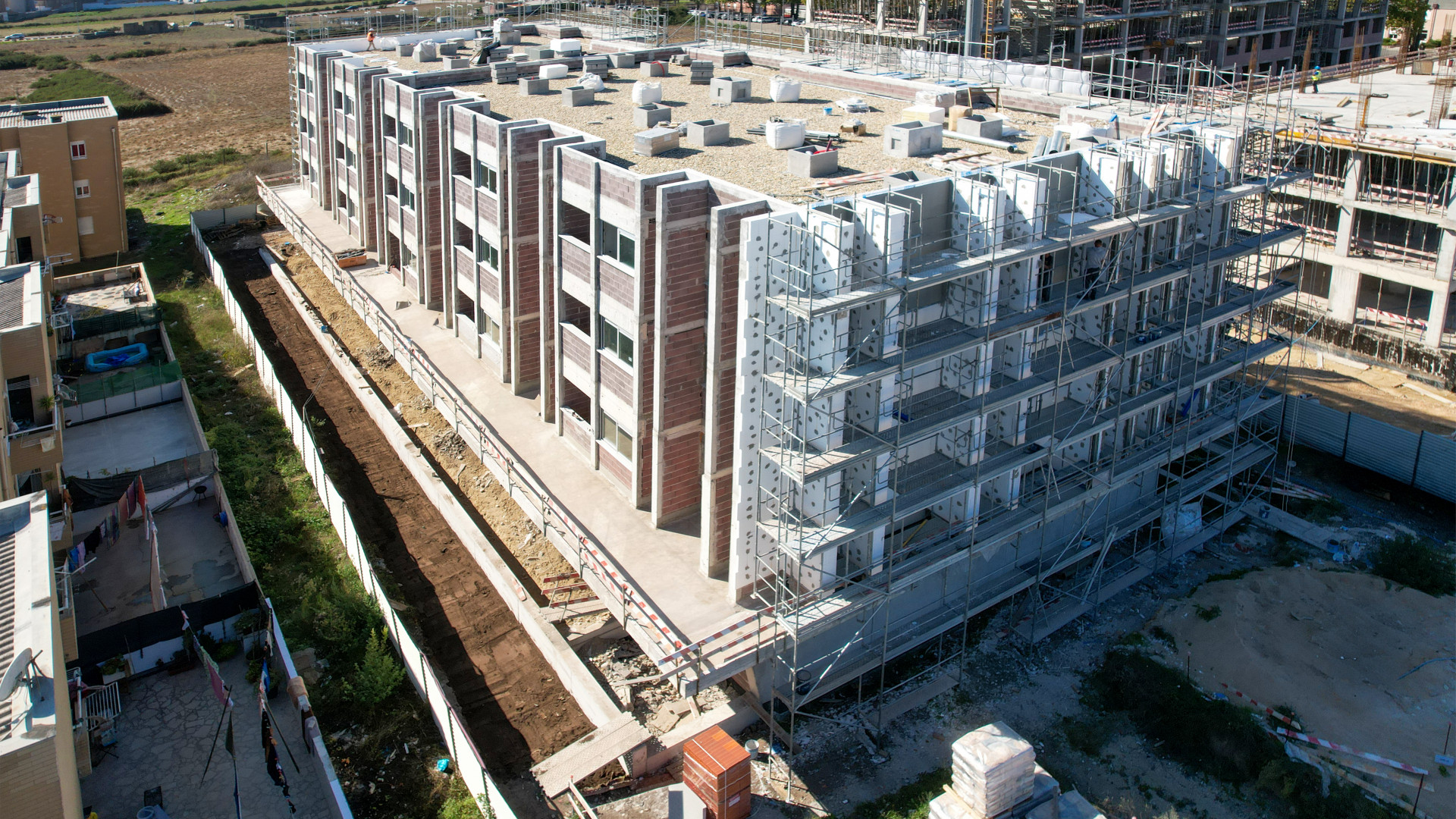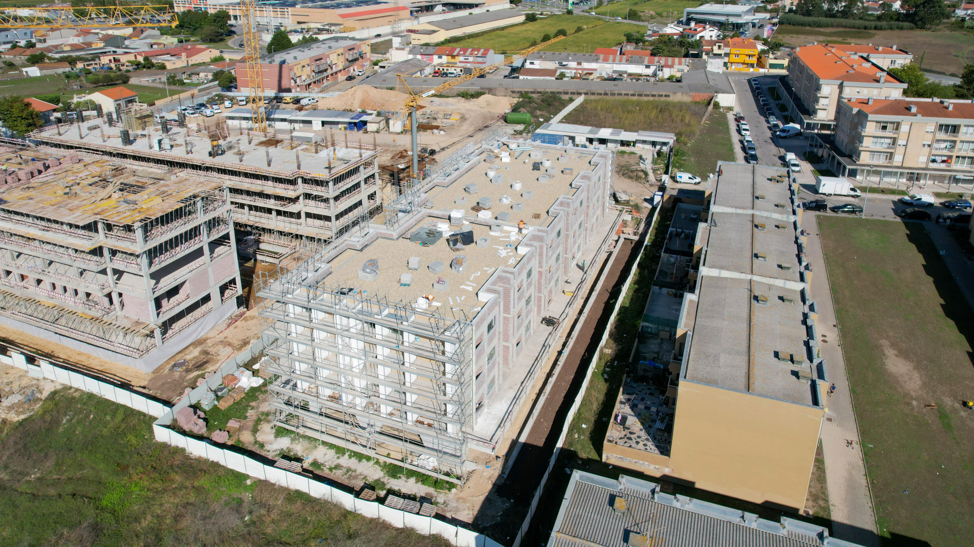 Neste momento, estão em execução as pinturas, os trabalhos de fachadas, incluindo reboco e aplicação de capoto, o assentamento de cerâmicos, a instalação de gesso cartonado, bem como as especialidades de eletricidade, hidráulica, carpintaria e infraestruturas.