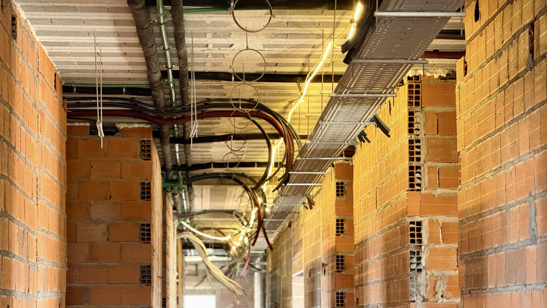 No piso térreo, após a conclusão dos rebocos projetados e das infraestruturas hidráulicas, elétricas, de gás e mecânicas, decorre atualmente a execução das estruturas de suporte para tetos falsos.